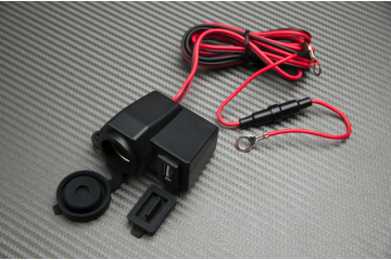 Charger with cigarette-lighter socket, output in 12V, and USB plug, output in 5V, sold with its handlebar fastening system.